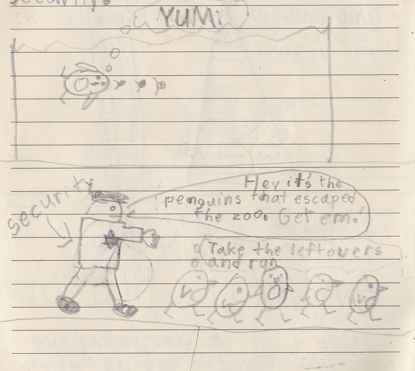 We went to the aquarium today. We dove into the tank full of small fish. Before spectators knew it, we had eaten almost all of them. And before we knew it, we were being chased by security.