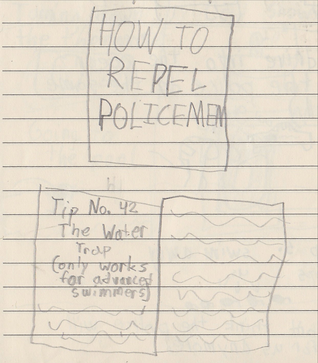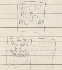 We found out that any policeman who caught us would get a $1000 reward. We saw a bunch of cops looking for us. So we decided we needed a plan. We eventually found a book at the library. It was a book full of tips on how to repel cops.