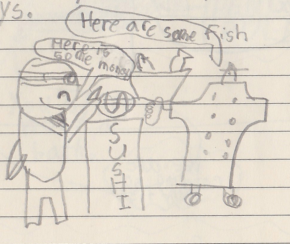 We saw an ad for an iPhone, and we decided we really wanted one. But Harold had run out of money since we spent it all. Then Steve got an idea. We went fishing again and sold our fish to the sushi restaurant. We should have the money to buy an iPhone in a few days.