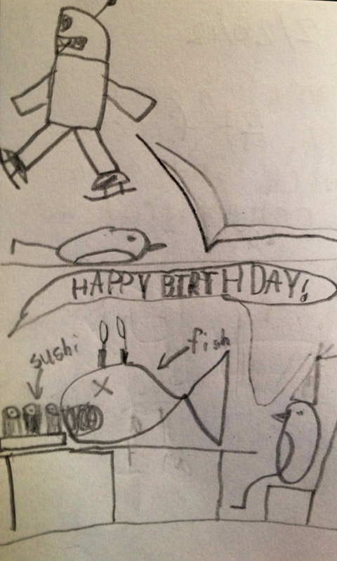 Today was Frank’s second birthday (really it was his eighth, but he was born on a leap year). We went iceskating and saved a lot of money because Robo Bob has built in skates and all of us penguins could belly slide. Only Matt needed to buy skates.