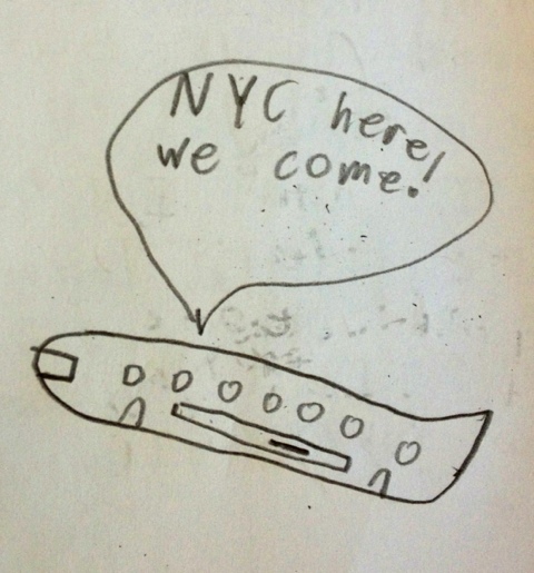 We are on a plane headed to NYC. We are flying first class, and I think we have already eaten all the fresh fish on the plane.