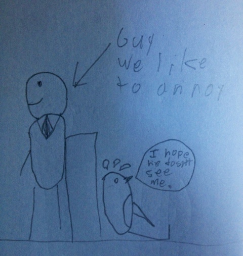 The guy we like to annoy got a job at the same place we work in an office right next to ours. We were afraid he would try to kill us. We spent the day hiding from him. We are moving to another office tomorrow.