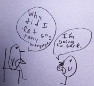 We got up this morning and had huge stomach aches because of all the cheese burgers.