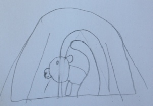 We went to the beach, and when we got back to the campsite, the bear from yesterday was living in our tent. We decided to go to a hotel.
