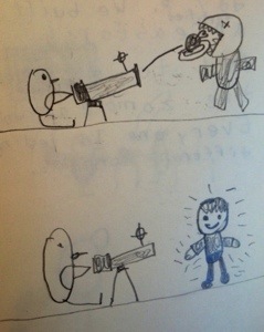 Zombie Invasion Day 6: We found out that the cure to a zombie virus caused by McDonald’s Hamburgers was gourmet food. We used our cannon to cure the zombies.